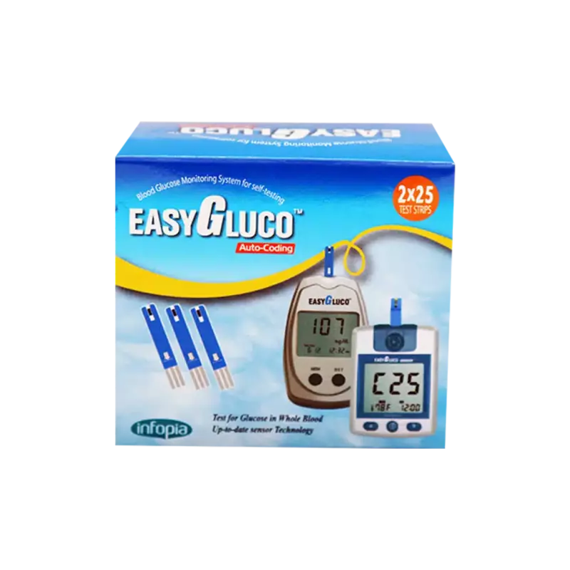 • نوار تست قند خون «ایزی‌گلوکو EasyGluco» برای استفاده در دستگاه تست قند خون ایزی گلوکو Easy Gluco می باشد. برای انجام تست قند میزان 1.5 میکرولیتر خون را بر روی نوار تست Easygluco قرار دهید تا پس از 9 ثانیه نتیجه تست قند را بر روی صفحه نمایش دستگاه مشاهده نمایید.در هر بسته از این محصول، دو قوطی نوار 25 تایی قرار دارد. توجه داشته باشید نوارهای تست قند خون به رطوبت، نور و هوا حساس هستند و پس از برداشتن نوار برای انجام تست قند خون در ظرف را سریع ببندید. همچنین نوارهای تست قند خون موجود درون ظرف نیز پس از باز شدن در ظرف، باید حداکثر در مدت 3 ماه از آنها استفاده نمایید.