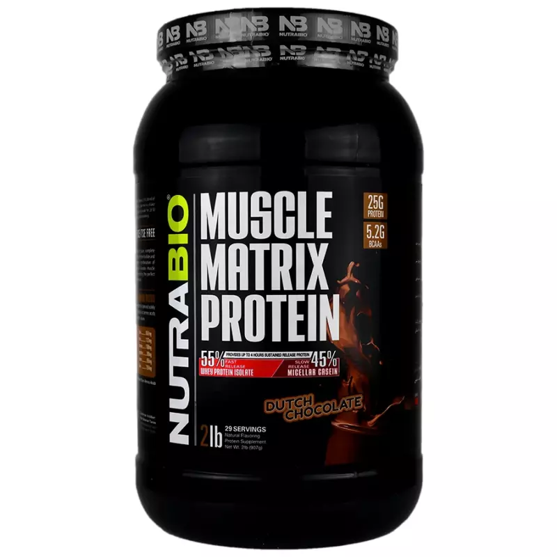 پودر پروتئین ماسل ماتریکس نوترابایو طعم شکلات هلندی907 گرمی Muscle Matrix Protein Nutra Bio-907 g
