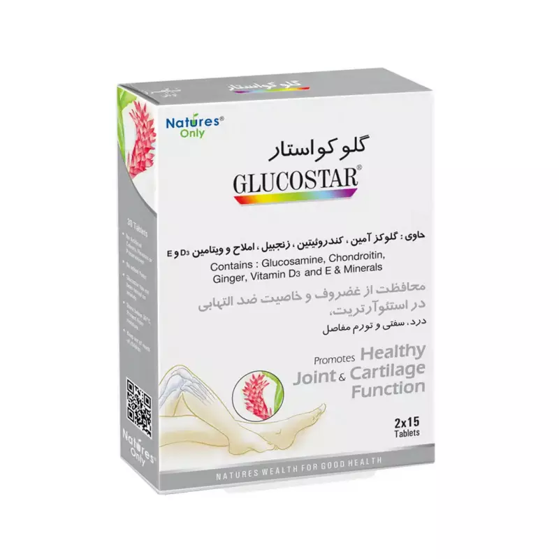 - glucostar، دارای خواص ضدالتهابی و کمک به کاهش التهاب و تورم مفاصل به واسطه داشتن گلوکزآمین، کندرویتین و زنجیبل