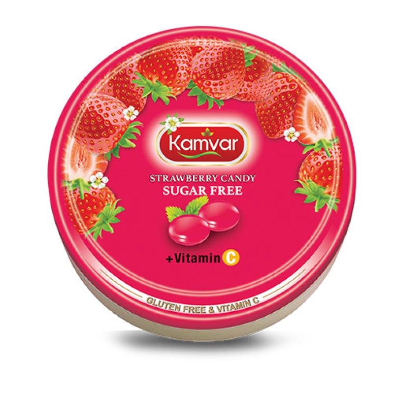 آبنبات بدون قند و رژیمی کامور حاوی ویتامین سی طعم توت فرنگی قوطی 64 عددی Sugar Free Candy